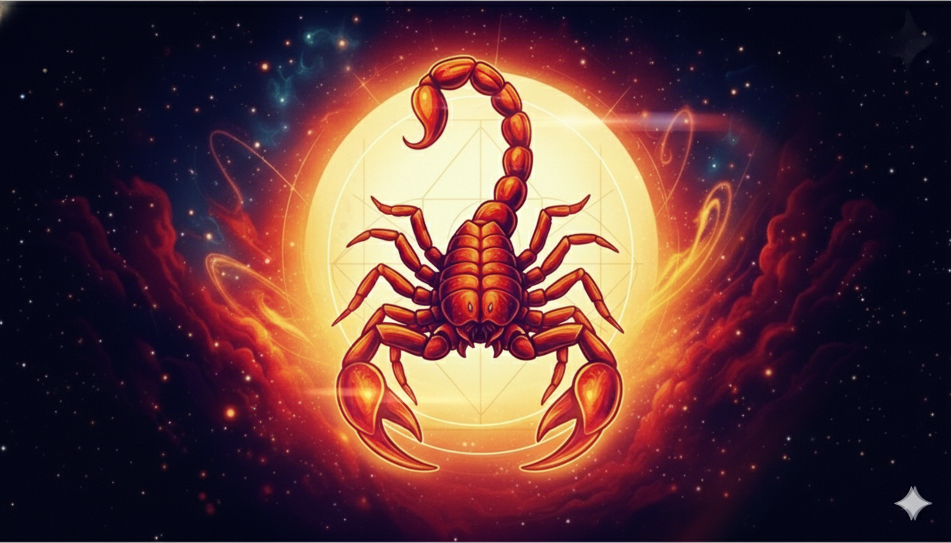 El Escorpio ♏ que representa un exterior protector pero peligroso, paciencia y un «aguijón» o enfoque intenso y calculado.